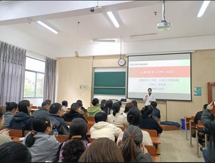 校医院副院长孙红旭担任主讲,她强调,后勤及相关岗位员工作为校园服务保障一线力量,其急救能力直接关乎突发状况下“黄金救援4分钟”的救援成效。培训中,孙红旭结合最新急救医学指南,拆解心肺复苏全流程,明确按压位置、深度、频率等核心参数,并针对性纠正常见操作误区,帮助参训人员夯实理论基础。