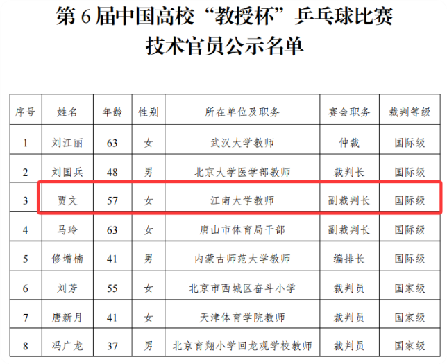 第6届中国高校“教授杯”乒乓球比赛技术官员公示名单