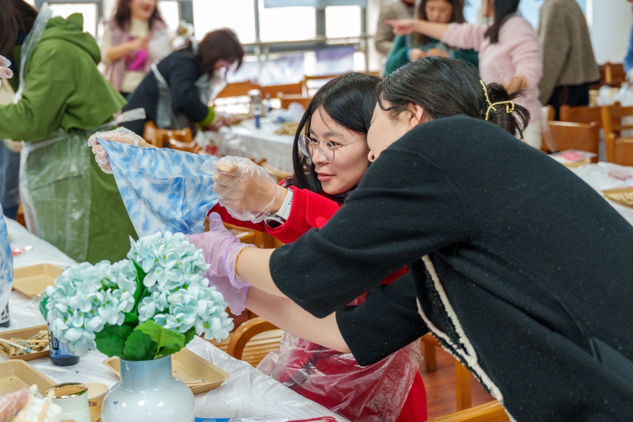 随后的扎染体验环节,扎染老师详细讲解了扎染非遗文化历史,扎染的材质和捆扎的多种技法,在老师手把手示范中,一件件蓝白作品在指尖流出,清新雅致、独具匠心,承载着老师们对美好生活的向往,也展示了老师们优雅与积极向上的风采。大家纷纷表示此次活动既有温度又有意义,放松了身心、凝聚了力量。