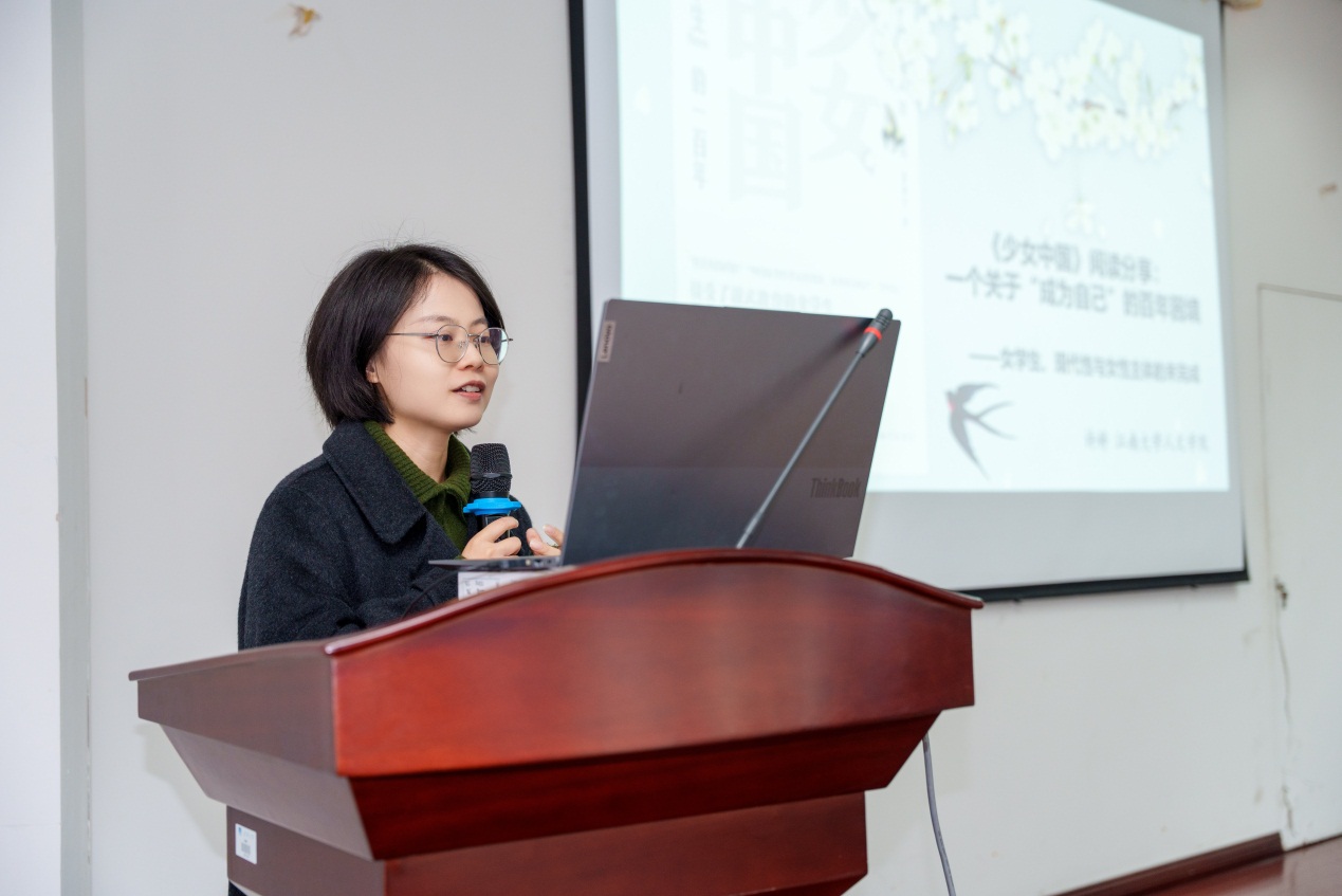 活动开始,首先邀请人文学院许婷老师为大家分享了《少女中国》一书,她带领大家回顾了女性在近代历史中被赋予的多重身份:既是国家期望的“新女性”,又是家庭所需的“贤妻良母”,更是一个个渴望成为“自己”的个体,从文学的角度阐述了中国百年来女性追求自我独立的力量。分享会最后以“少女的冒险,仍在路上”收尾,引发在场听众的深切共鸣。本次活动不仅是一次文本的阅读分享,更是一次关于女性主体性与现代性反思的思想碰撞,激励我们在当下继续追问、勇敢前行。