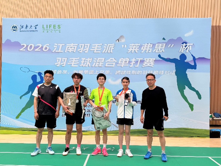3月28日,由江南大学教职工羽毛球协会主办的2026江南羽毛派“莱弗思”杯羽毛球混合单打赛在校体育训练馆激情开赛。本次赛事吸引了来自甲、乙两组共80位羽球高手同场竞技,为这个春日增添了一份运动的火热。