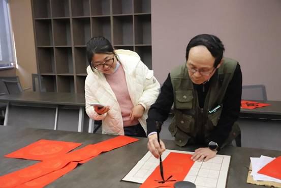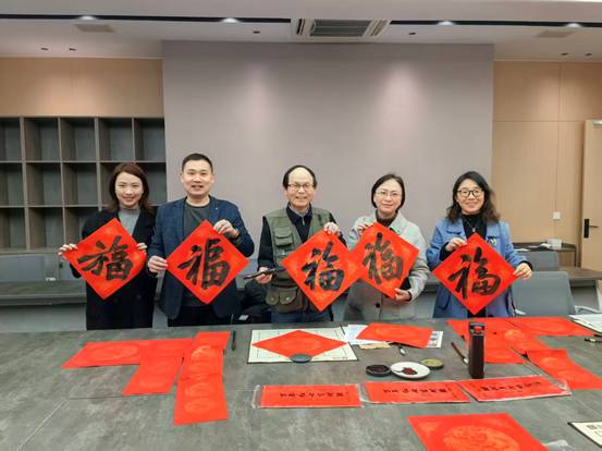 随后的“墨香迎福”写春联送福字环节,现场邀请了江南大学宣传部胡奕老师和有书法功底的同学担任“送福使者”。研磨挥毫,笔走龙蛇间,一幅幅寓意吉祥的春联、一个个饱满灵动的“福”字跃然纸上。老师们或驻足围观,或亲自提笔尝试,墨香氤氲中,大家互相切磋笔法、分享年味,一张张红纸承载着真挚的祝福,传递着同事间的深厚情谊。