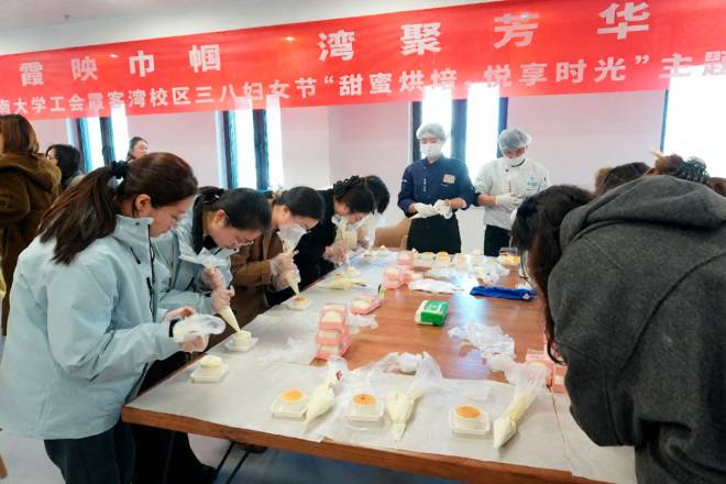 本次系列活动还分别在3月3日和3月10日开展了“水芹基地研学活动”和“甜蜜烘焙 悦享时光”活动。“水芹基地研学活动”在月城镇花塘水芹主题产业园举行,校区教职工代表与孩子们深入田间地头,实地参观种植基地,认真聆听负责人讲解水芹种植历史、现代农业技术及“水芹+文旅”融合路径。作为一堂生动的乡村振兴实践课,既加深了参与者对特色农业的认知,也为后续研学路线策划积累了宝贵经验,实现了校地共建的深度对接。“甜蜜烘焙 悦享时光”活动在教工之家举行。在专业烘焙师的指导下,女教职工们亲手制作雪媚娘与杯子蛋糕,现场香气氤氲、笑语盈盈,大家在掌握烘焙技巧的同时,有效缓解了工作压力,增进了彼此情谊。该活动以“小课堂”形式传递了校工会对女教职工的细致关怀,为后续赋能课程奠定了良好基础。
